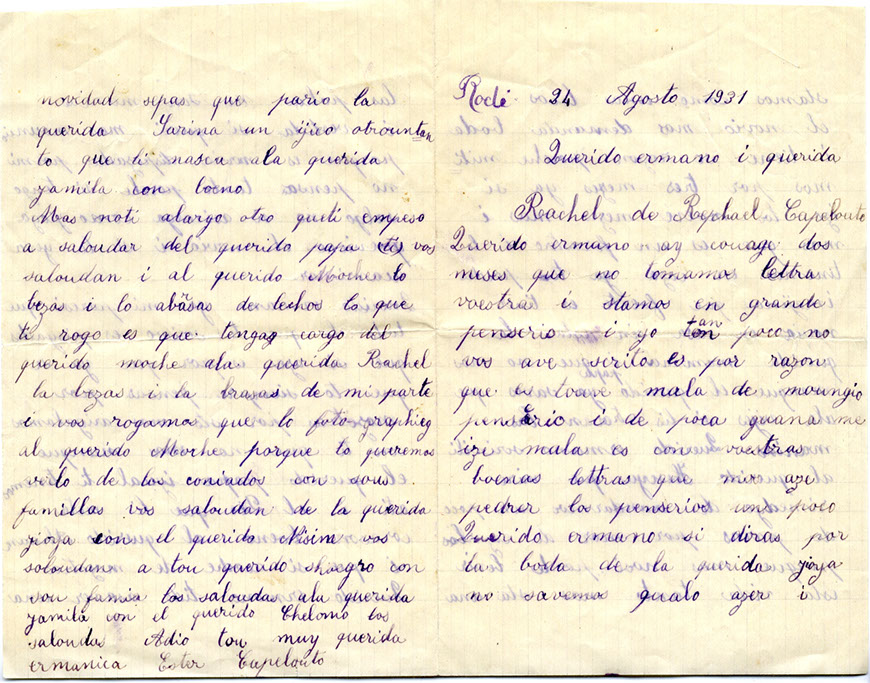Letter written in Ladino from Rhodes by Claire Barkey, Aug. 24, 1931.