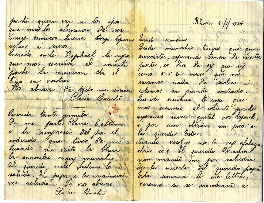 Letter written in Ladino from Rhodes by Claire Barkey, Jan. 4, 1936.