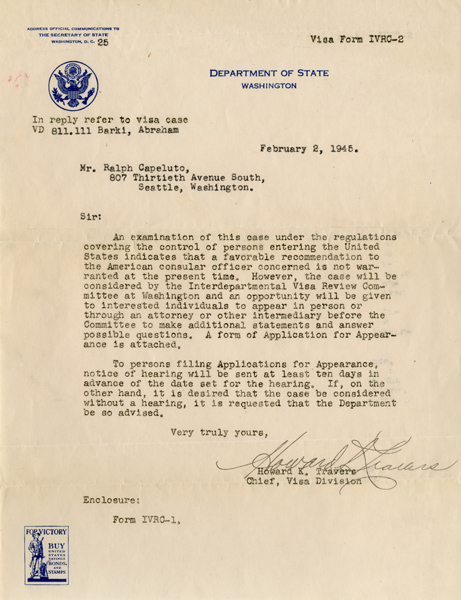 Letter from the U.S. State Department denying entry to the United States, Feb. 2, 1945.