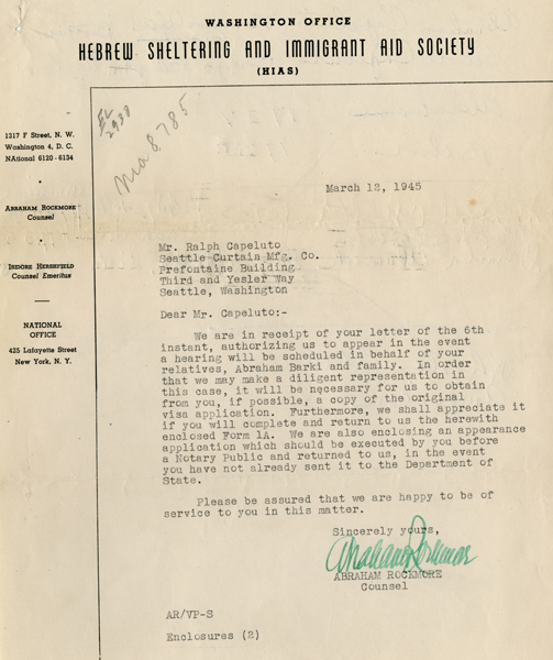 Letter from the Hebrew Sheltering and Immigrant Aid Society to Ralph Capeluto, March 12, 1945.